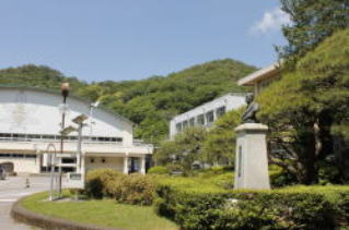 近藤徳太郎先生の像と体育館外観 図書室側から西方向の管理棟の様子
